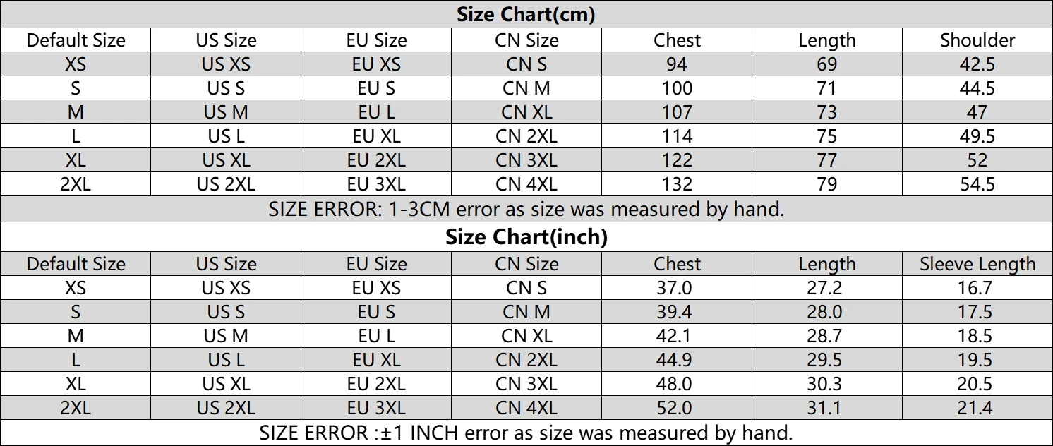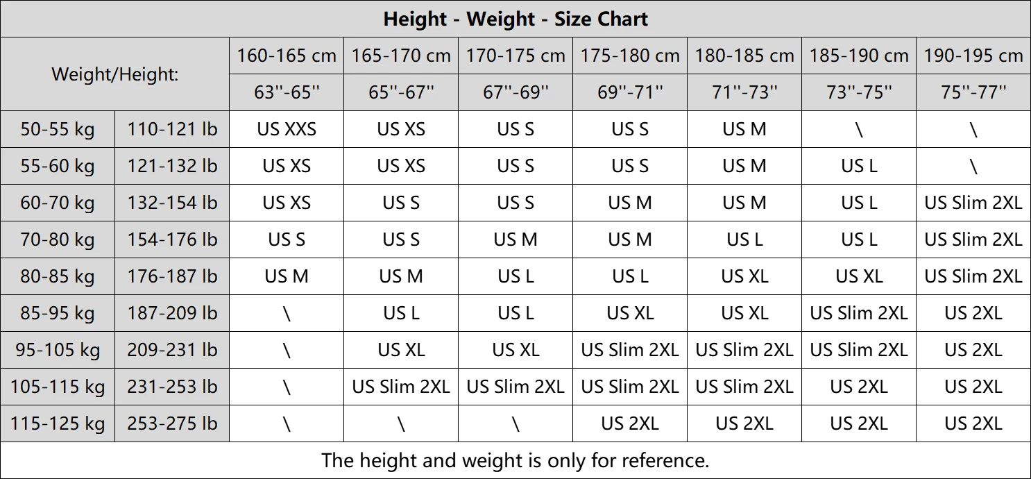 CN S(US XS), CN M(US S), CN L(US M), CN XL(US L), CN 2XL(US XL)CN 3XL(US 2XL)