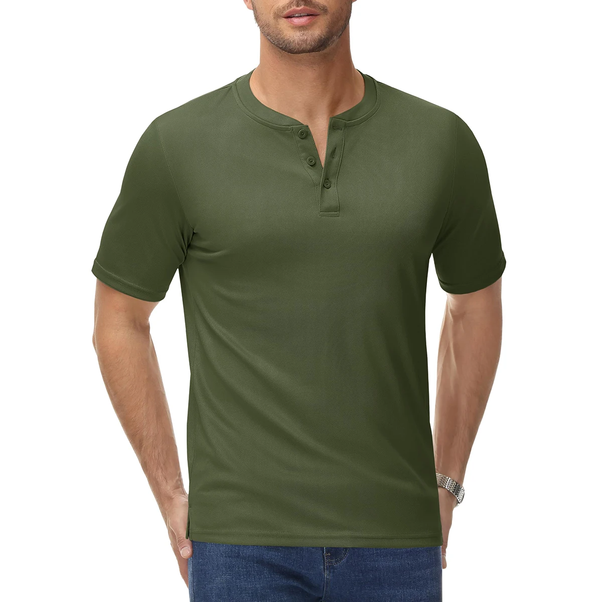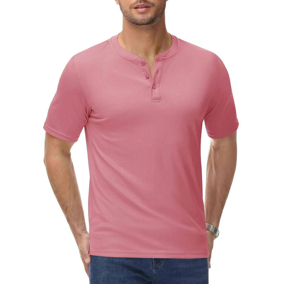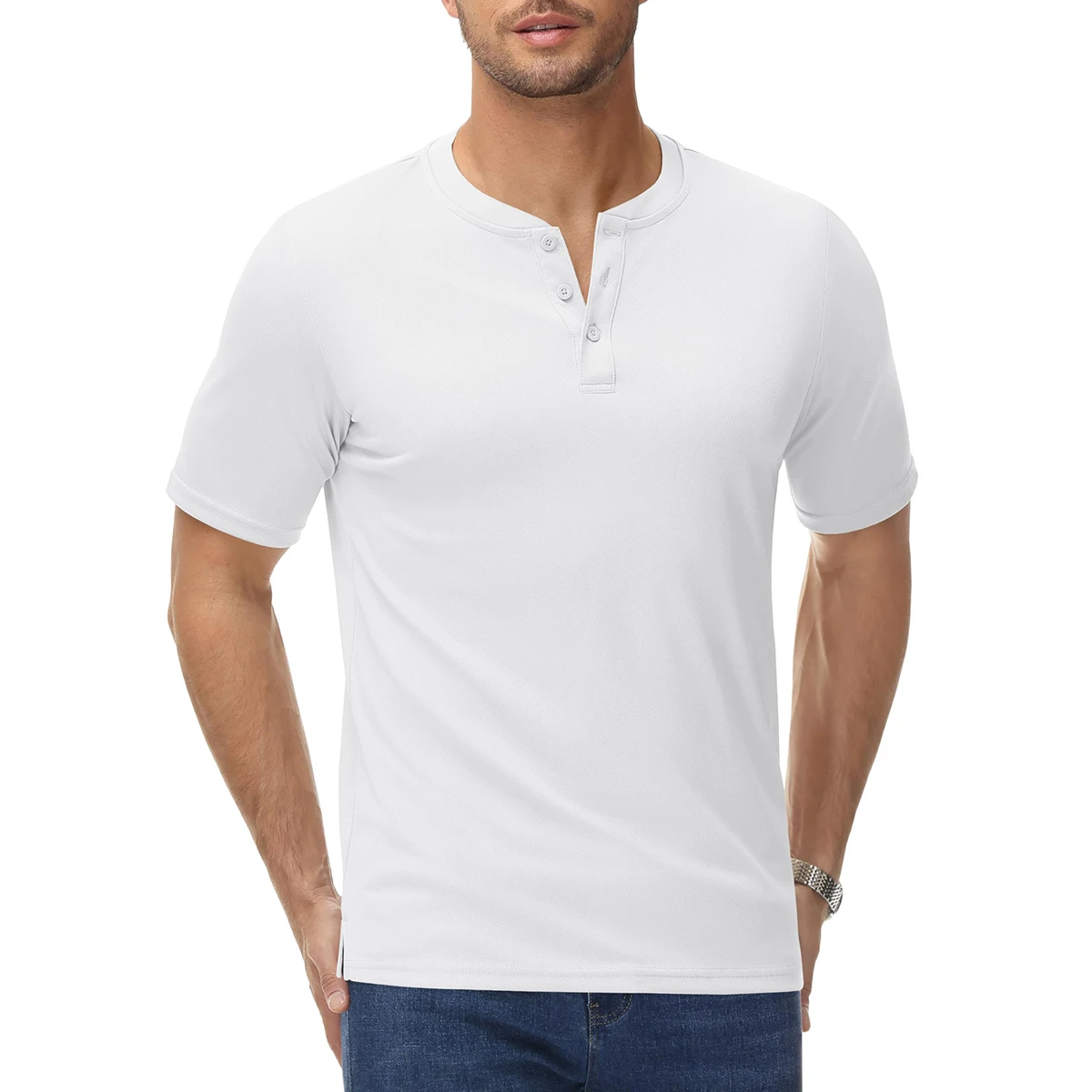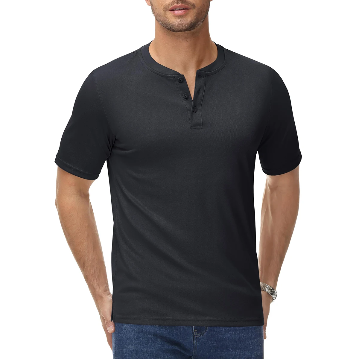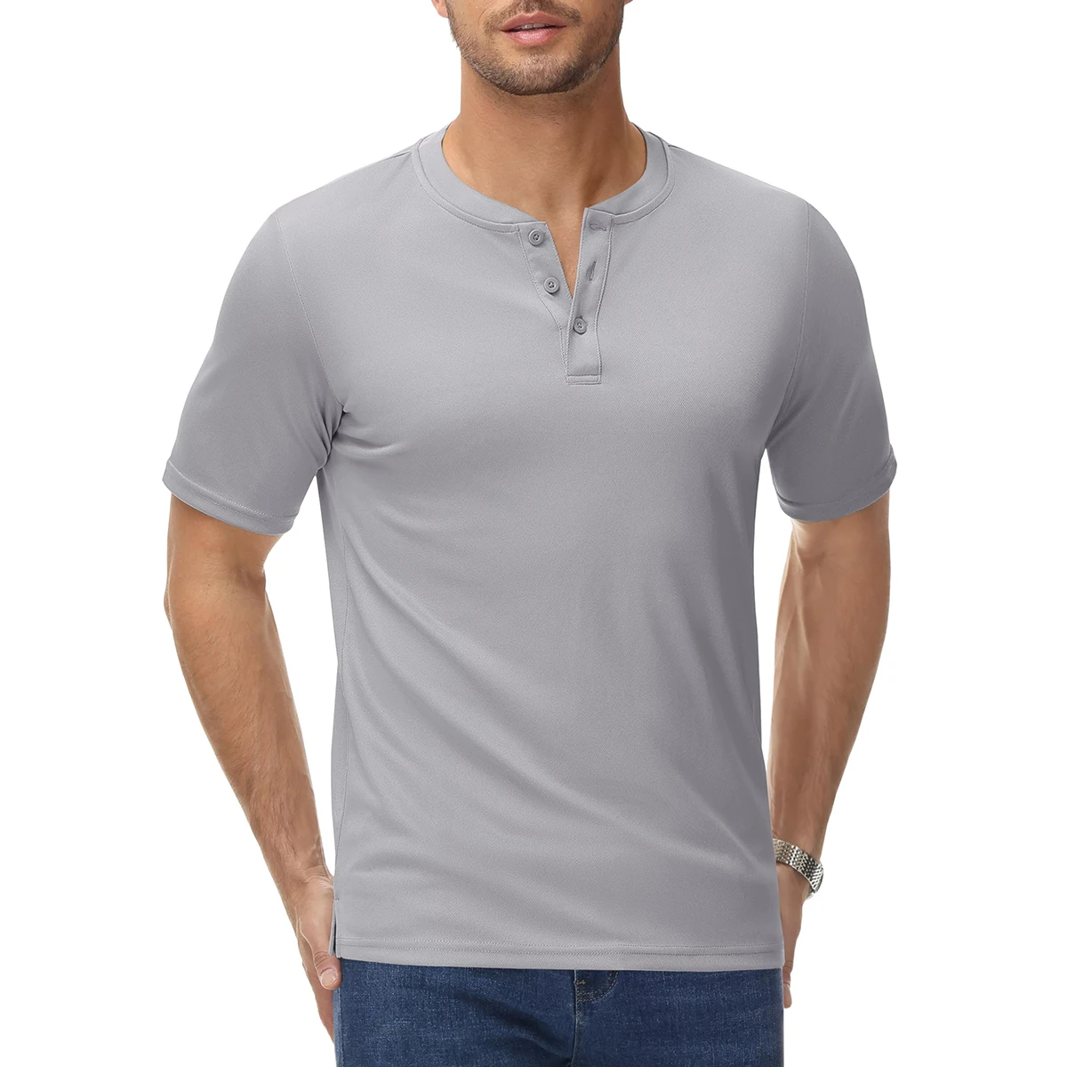 This lightweight Henley shirt features a classic 3-button collar and quick-dry fabric, offering a masculine look and relaxed comfort for any casual summer day.
